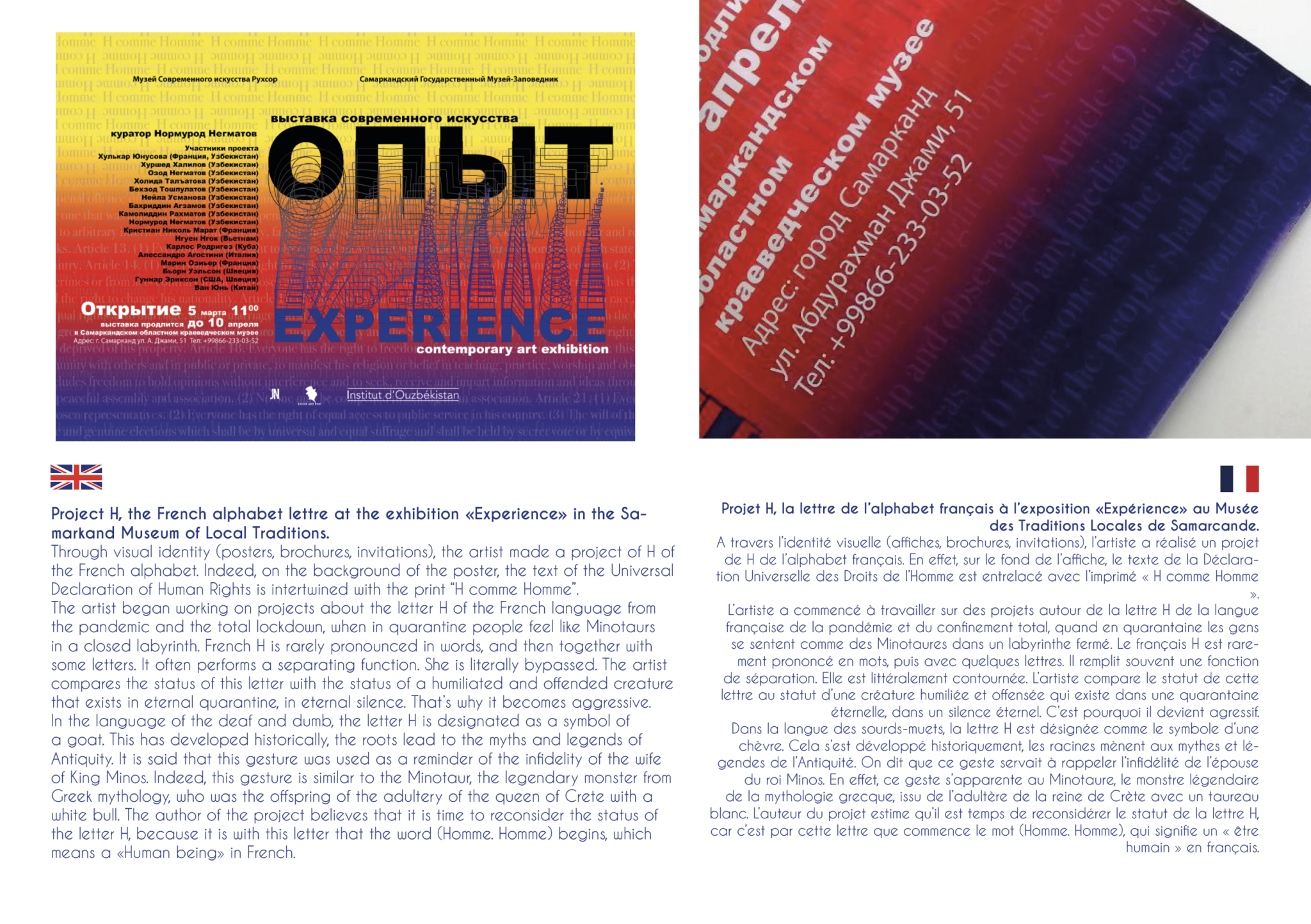 2021 – «H comme Homme» projet artistique : l’identité visuelle pour la premiètre exposition de l’art contemporain dans le contexte de musée à Samarkand, Musée de Samarkand d’Etat de l’Histoire Culturelle d’Ouzbékistan.